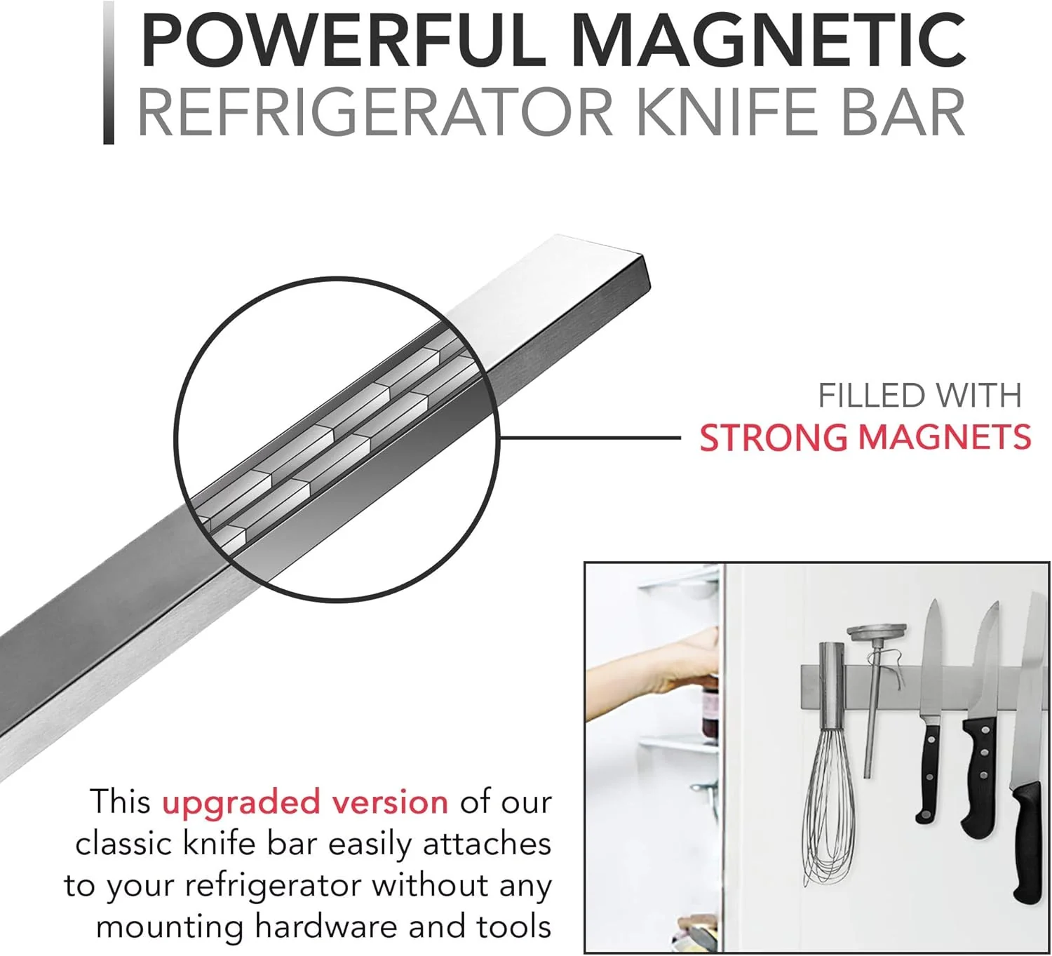 FULLY MAGNETIC SURFACE: The entire bar is magnetic, securely hanging kitchen knives instantly and without hassle.