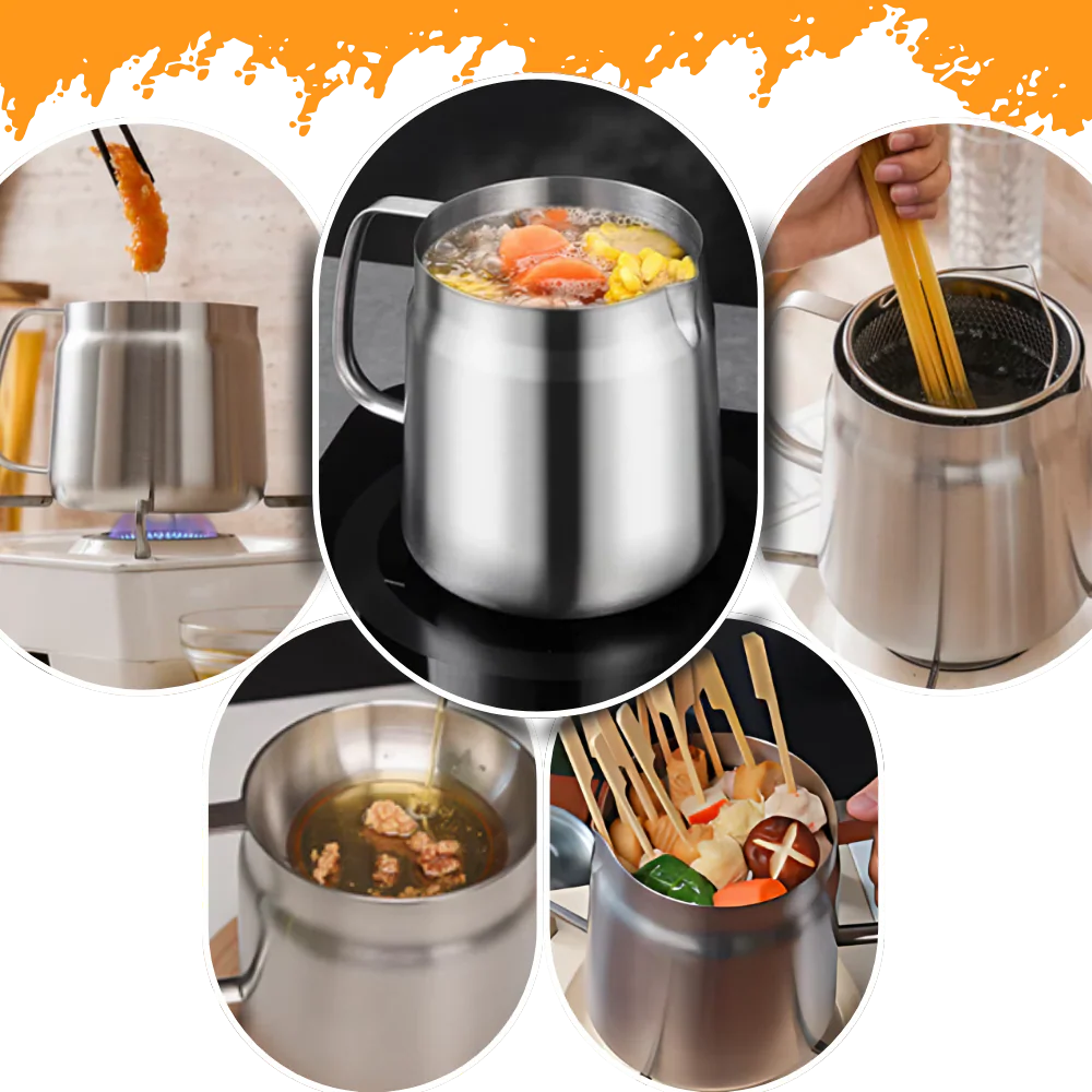 The 2-in-1 Stainless Steel Deep cooking Pot simplifies cooking and oil reuse. Its sizable filter net makes oil straining easy and quick, making it ideal for cooking without effort and easily reusing oil.